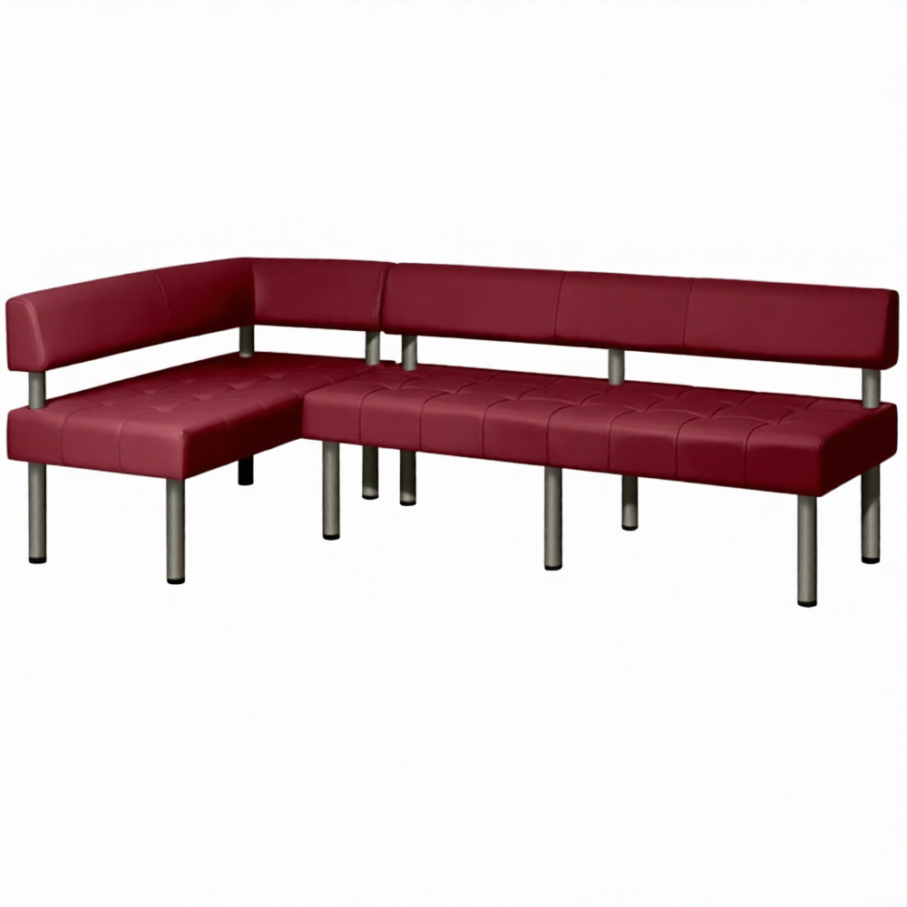 Обивка изготовлена из высококачественного кожзаменителя, устойчивого к загрязнениям и механическому воздействию. Это идеальное решение для общественных мест с большим потоком посетителей. Толщина сиденья составляет 170 мм с декоративной простежкой, что придает изделию элегантный внешний вид. Прямоугольная спинка закреплена на хромированных опорах, придавая конструкции надежность и устойчивость. Мебель поставляется в полностью собранном виде, что облегчает установку и сокращает затраты времени на монтаж.