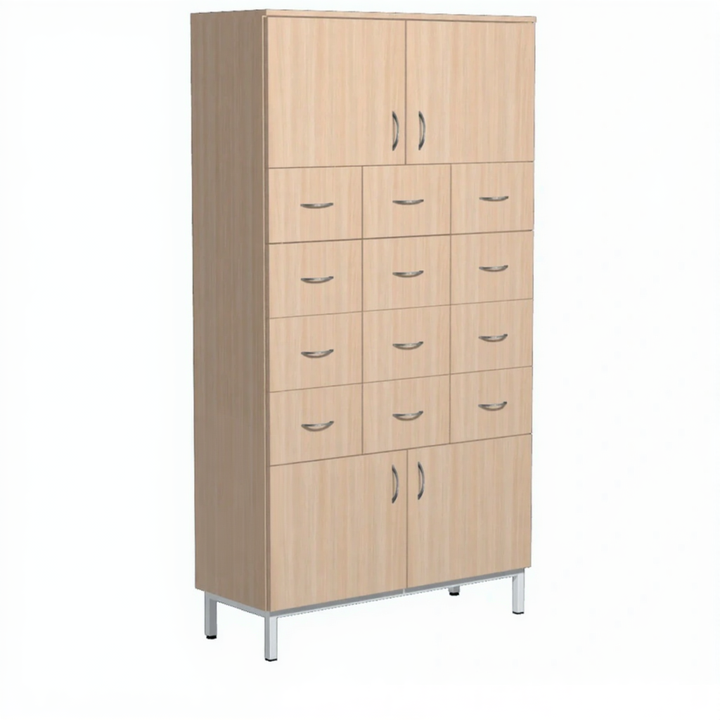 • Наполнение: по середине шкафа - 12 выдвижных ящиков на шариковых направляющих, (по 3 ящ. 4 ряда). в верхней и нижней части шкафа по 2 дверки.