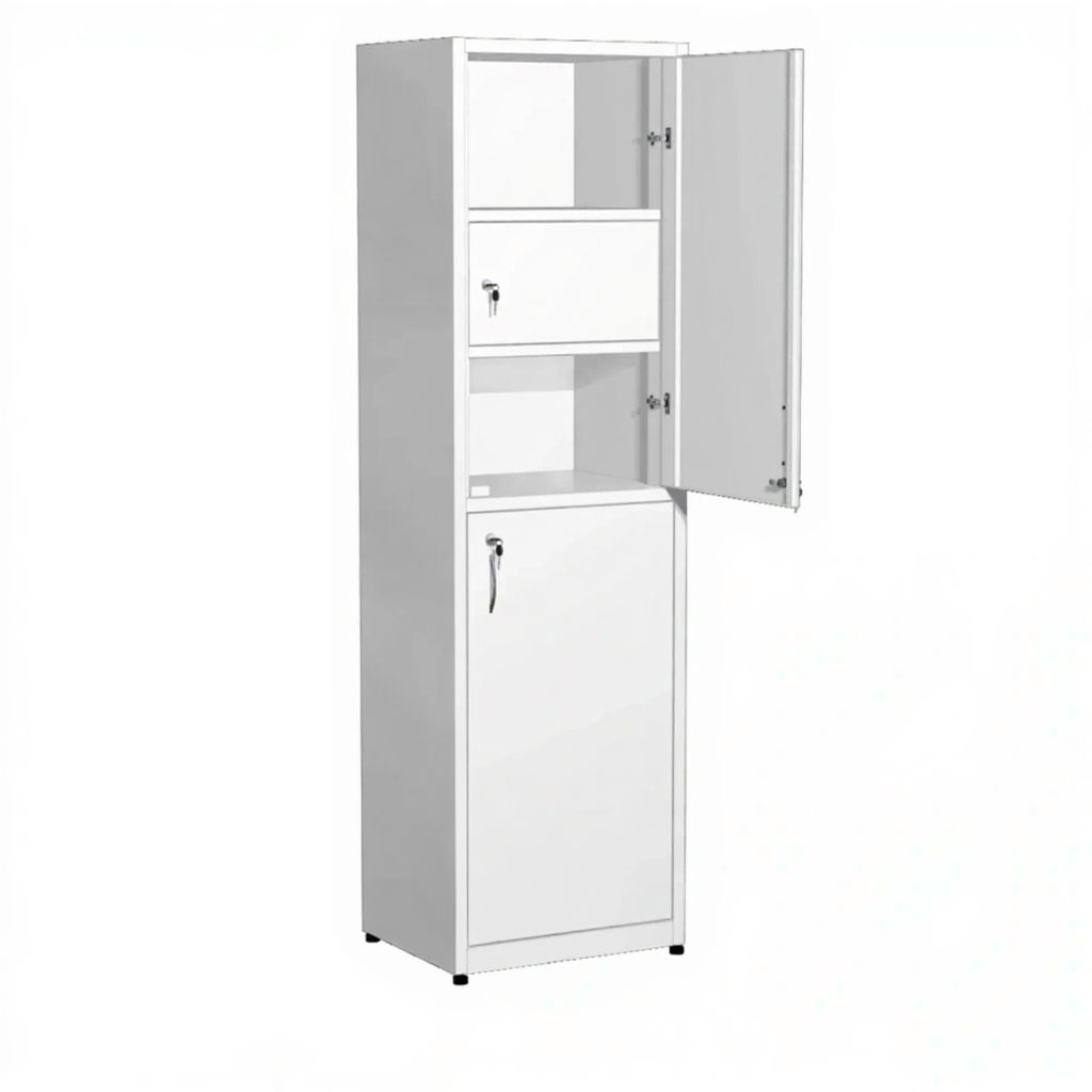 Шкаф металлический для медикаментов с сейфом ШдМп-4 (белый) активно используются в больницах, лабораториях, аптеках, где необходимо хранение медикаментов, медицинского инвентаря, одежды работников, приборов, больничной документации.