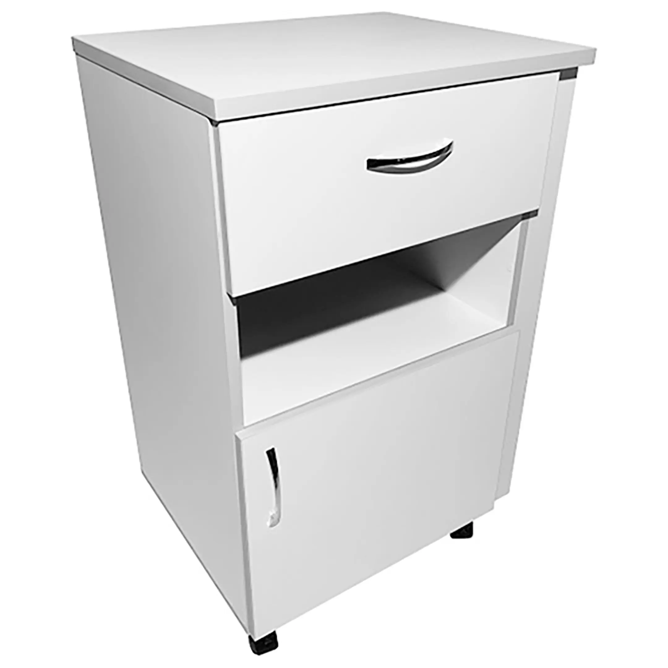• Тумба установлена на четыре колеса диаметром 50 мм, два из которых оснащены стопорами для устойчивости. Это обеспечивает лёгкость перемещения тумбы по палате и фиксацию её в нужном месте.