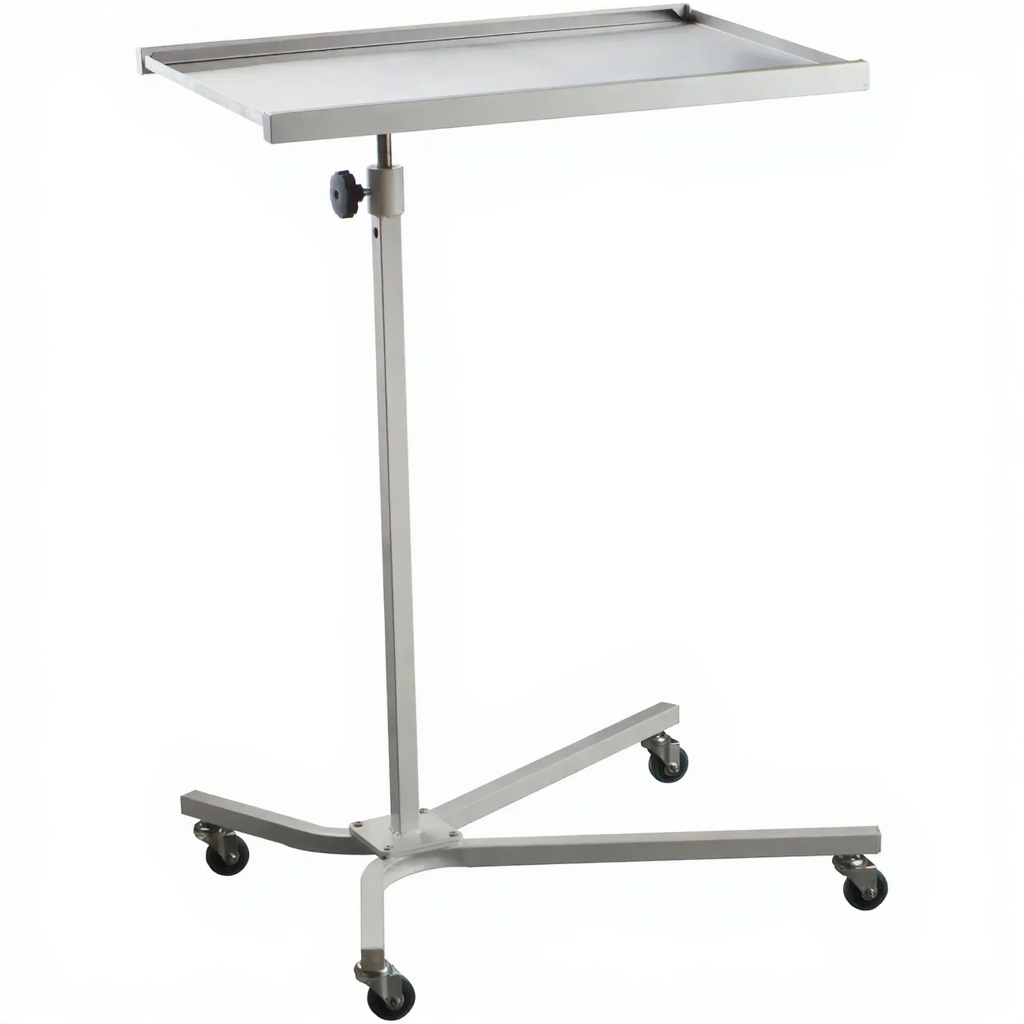 Стол медицинский инструментальный СМИ-01В — это легкий мобильный стол с регулируемой высотой, предназначенный для размещения медицинских инструментов и медикаментов в операционных палатах, процедурных кабинетах и иных кабинетах специалистов. Модель имеет Х-образное основание, столешницу и выдвижную стойку из нержавеющей стали, оснащена 4 колесиками.