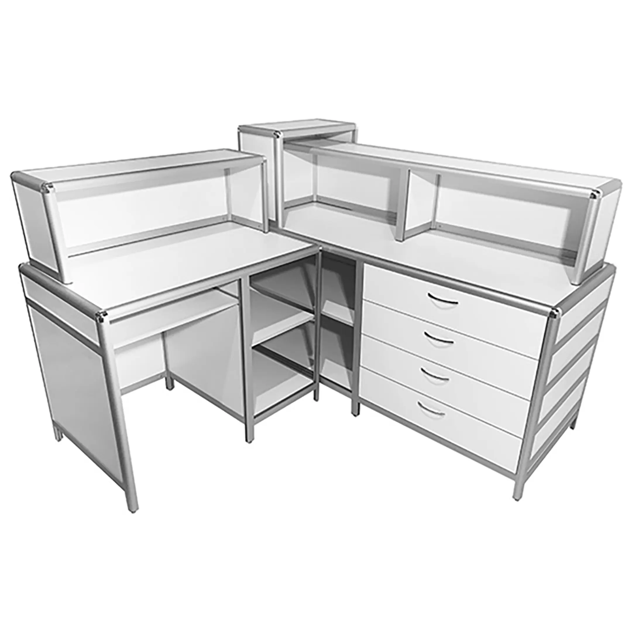 - Качественные материалы — обшивка из ЛДСП 8 мм, столешницы из ЛДСП 16 мм белого цвета, устойчивые к влажной уборке и обработке дезинфицирующими средствами.