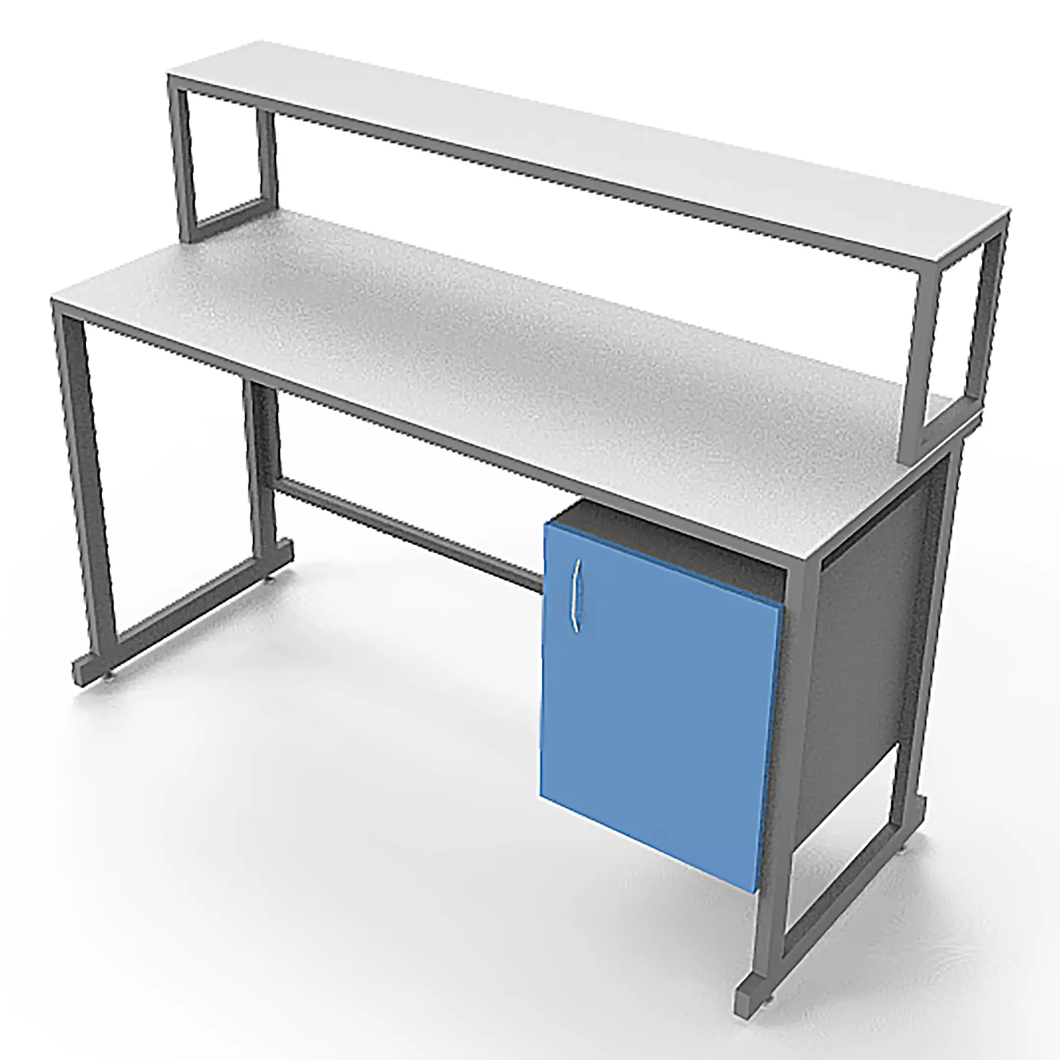 - Удобная система хранения — тумба под столешницей с распашной дверцей и надстройка с полкой для хранения материалов и оборудования.
