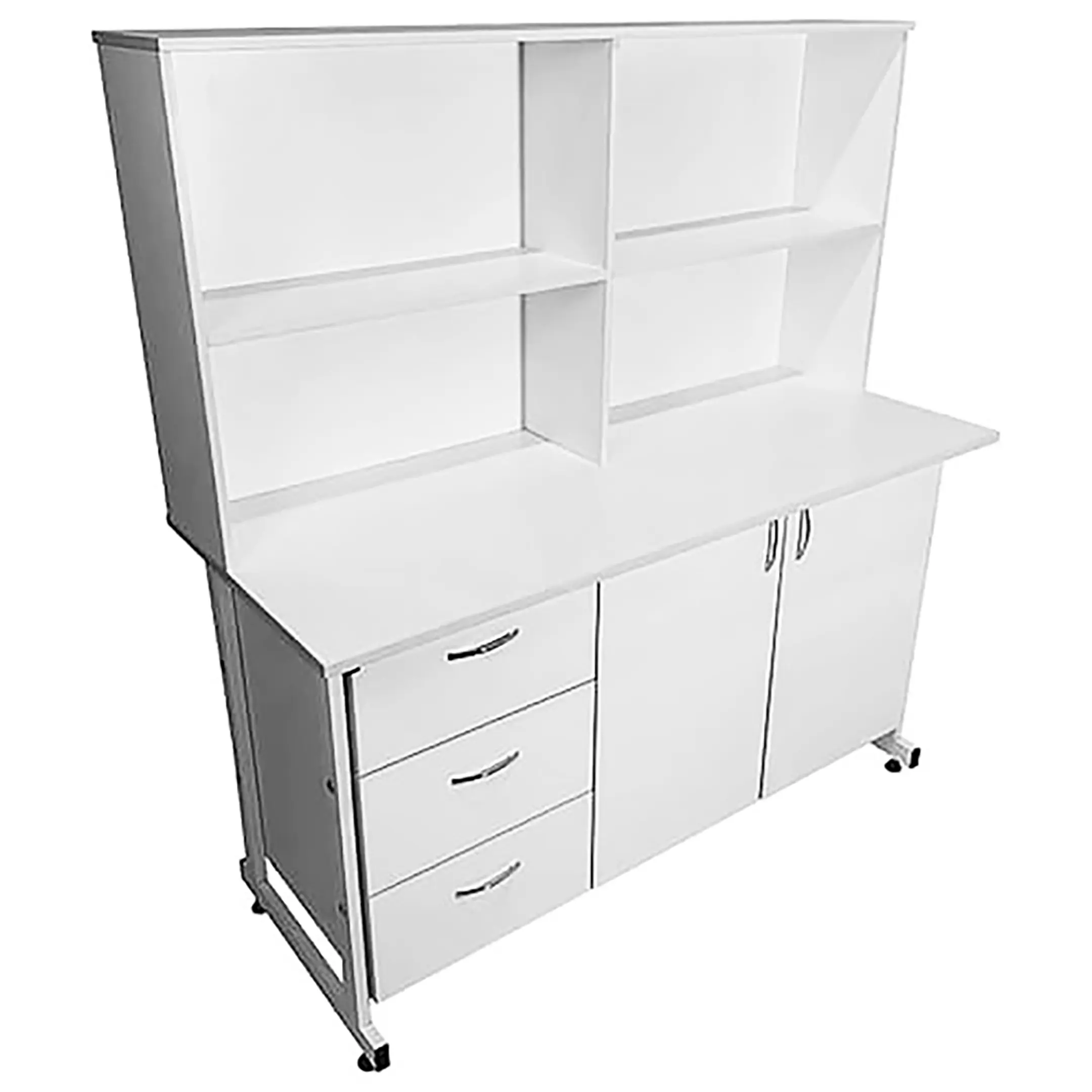 Стол-тумба лабораторная СТл 18.010 с надстройкой (белый) — это оптимальное решение для оборудования рабочего места лаборанта, занимающегося химическими исследованиями и нуждающегося в удобной системе хранения различных предметов. Модель оснащена слева отделением с тремя выдвижными ящиками, справа — отделением с двойной распашной дверкой и полкой, а также надстройкой с четырьмя нишами. Каркас выполнен из стального профиля, столешница из ЛДСП толщиной 22 мм.