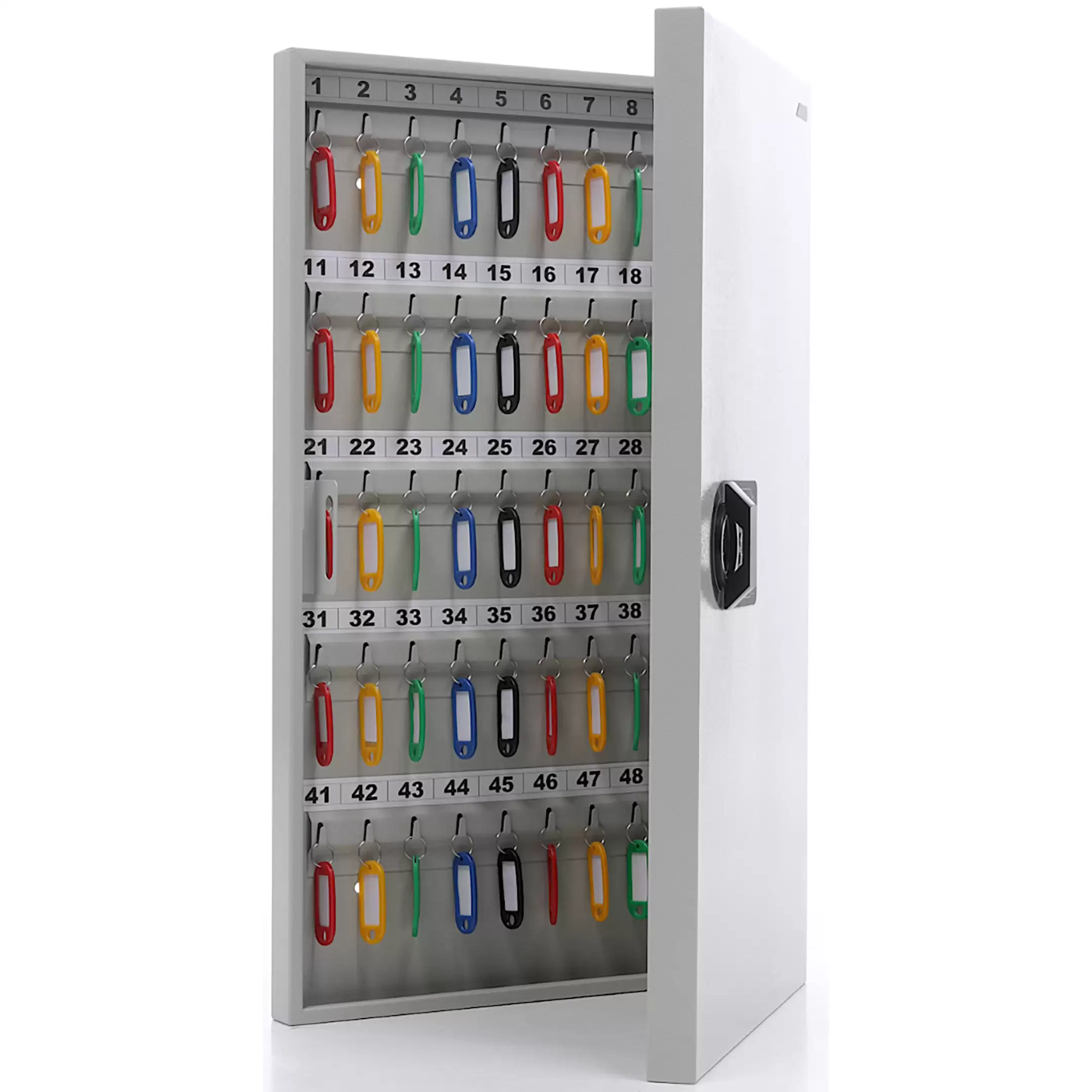 - Упорядоченное хранение и быстрый поиск — 95 металлических крючков и комплект цветных брелков с самоклеящимися номерками позволяют систематизировать ключи по помещениям, отделам или типу доступа, обеспечивая мгновенный визуальный поиск и легкий учет.