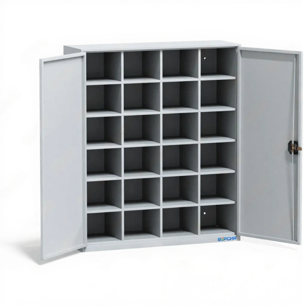 Шкаф для обуви на 24 ячейки увеличенный ОБ-24Д с дверьми — это вместительный шкаф с увеличенными ячейками и индивидуальными дверцами для хранения обуви. Модель сочетает в себе удобство глубоких отделений для крупной обуви и преимущества закрытого хранения, обеспечивая защиту от пыли и поддержание порядка.