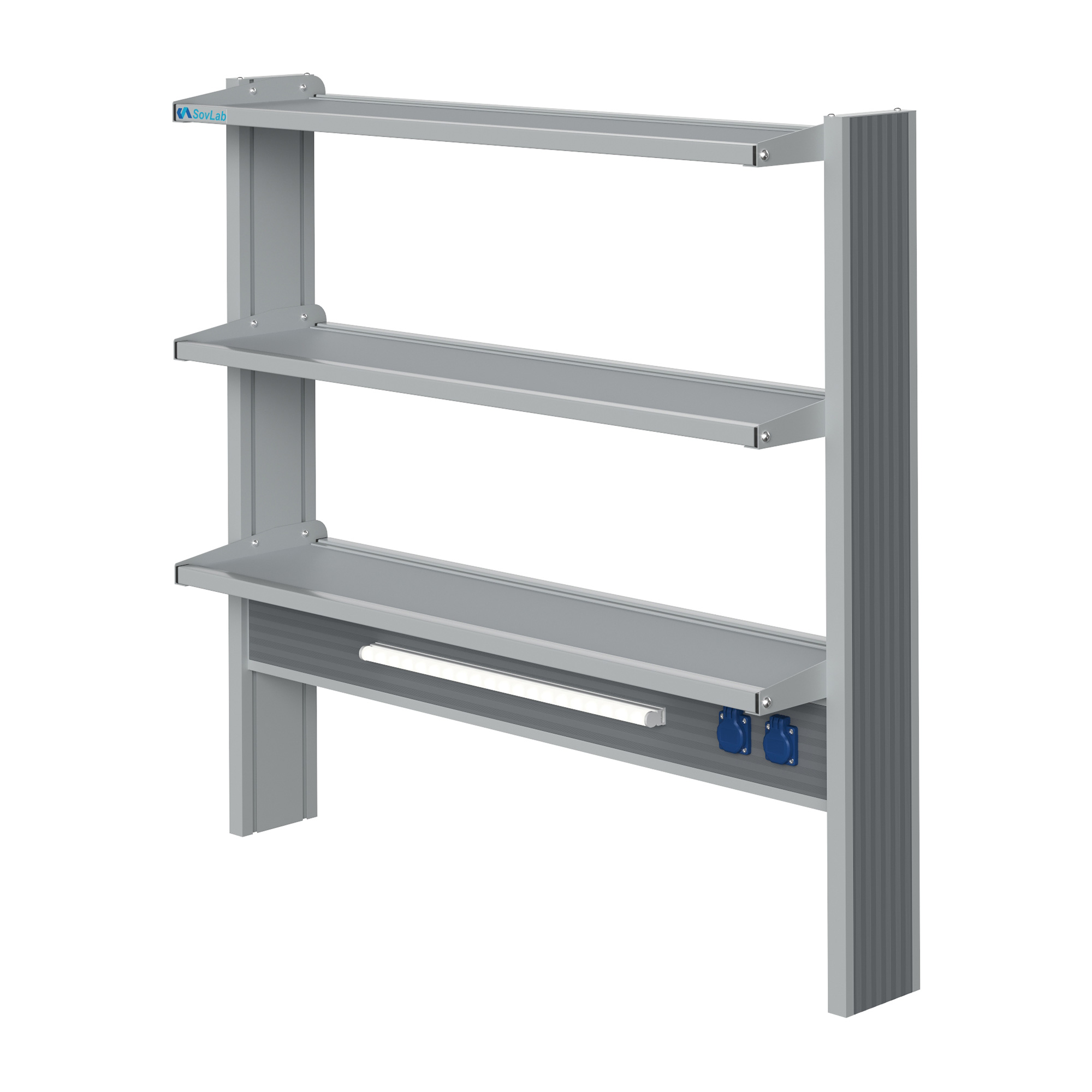 - Вместительная конструкция — три полки глубиной 300 мм в алюминиевых рамках позволяют разместить большое количество лабораторного инвентаря и оборудования.