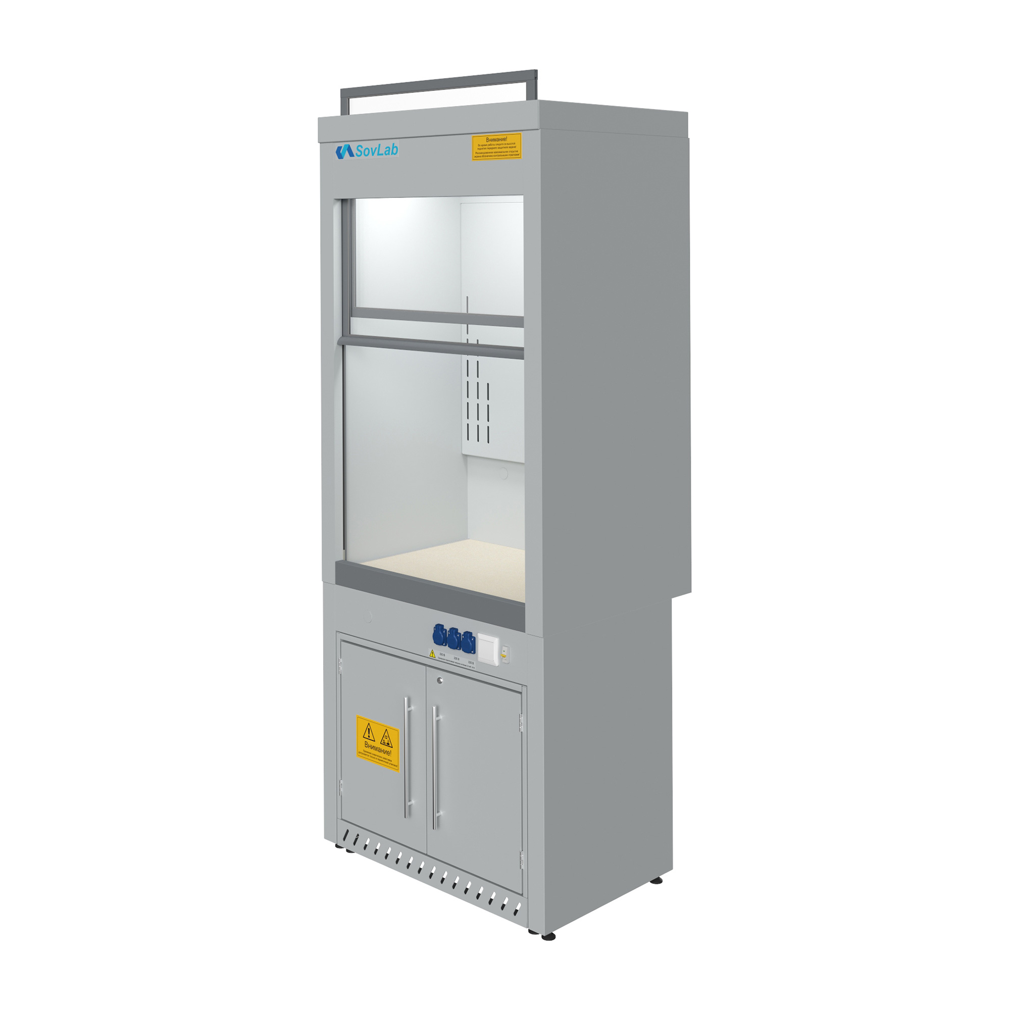 - Защитный экран — подъёмная панель обеспечивает безопасный доступ к рабочей зоне во время проведения лабораторных операций.
