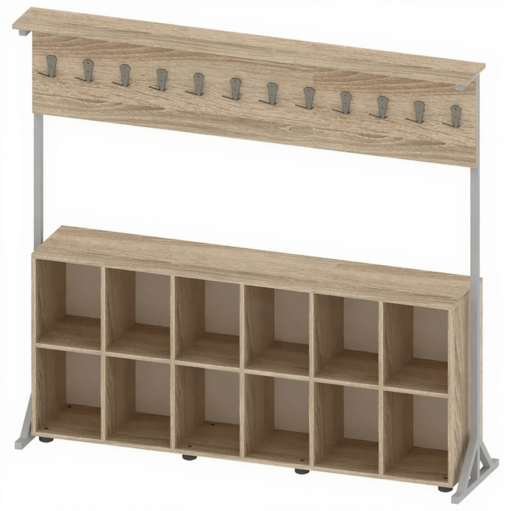 Вешалка напольная односторонняя с полками для обуви на 12 крючков ГР-ШП-3-1 — это практичное и функциональное решение для организации гардеробного пространства в образовательных учреждениях, офисах и общественных помещениях. Модель с односторонней конструкцией оснащена 12 крючками для одежды и удобными полками для обуви, что позволяет комплексно организовать хранение вещей. Вешалка предназначена для размещения верхней одежды, головных уборов и обуви, обеспечивая удобное хранение и поддержание порядка в гардеробной зоне.