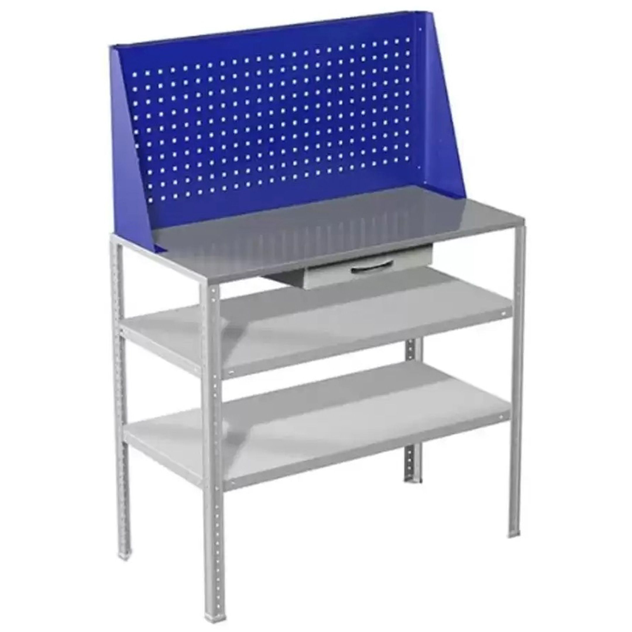 Обратите внимание: стойки верстака окрашиваются в синий цвет (RAL 5002, шагрень), а полки — в серый (RAL 7038, шагрень).