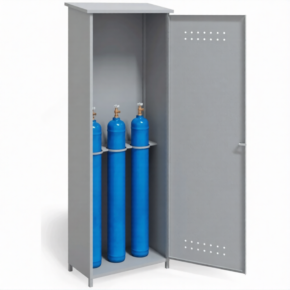- Идеальная вместимость для основных задач — шкаф рассчитан на хранение трех стандартных газовых баллонов, что является наиболее распространенной потребностью для множества небольших операций: сварочный пост (топливный газ + кислород + резерв), лабораторная установка или сервисное обслуживание. Он решает вопрос безопасности, не занимая лишнего места.