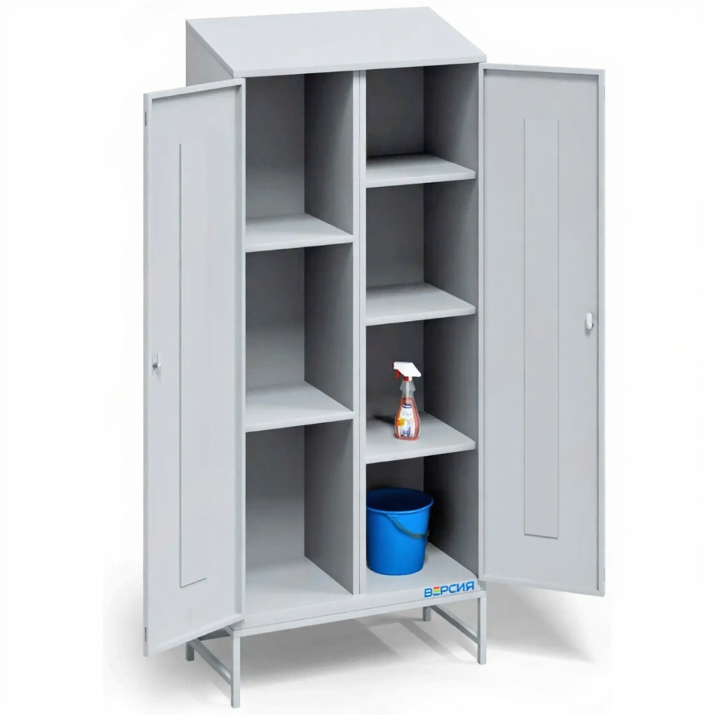 - Универсальность для хранения разнородных предметов — конфигурация с большим количеством полок делает шкаф пригодным не только для уборочного инвентаря, но и для хранения канцелярских запасов, архивных папок, средств индивидуальной защиты, небольшой техники или инструментов для текущего ремонта.
