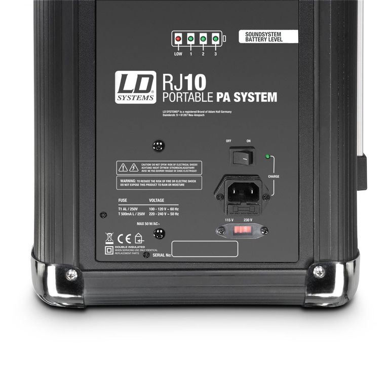 Активная акустическая система LD Systems Roadjack 10 – мобильная звуковая станция, оснащенная колесами и телескопической ручкой. Работает от аккумуляторного блока, который выдерживает до 20 часов беспрерывной работы. Активная двухполосная система Roadjack 10 с частотным диапазоном от 90 Гц до 18 кГц, пиковой мощностью 100 Вт, оснащена микшером с 3 входными каналами с индивидуальными регуляторами громкости, 2-полосным эквалайзером, реверберацией и мастер-громкостью. Встроенный проигрыватель обеспечивает потоковое воспроизведение звука при помощи Bluetooth, поддерживает также SD-карту и USB-накопитель. Меню проигрывателя включает в себя выбор языка и пресеты эквалайзера для нескольких жанров для мгновенной настройки звука. Roadjack 10 также имеет усиленные уголки для защиты корпуса, отверстие для крепления на стойке и удобный инфракрасный пульт дистанционного управления.